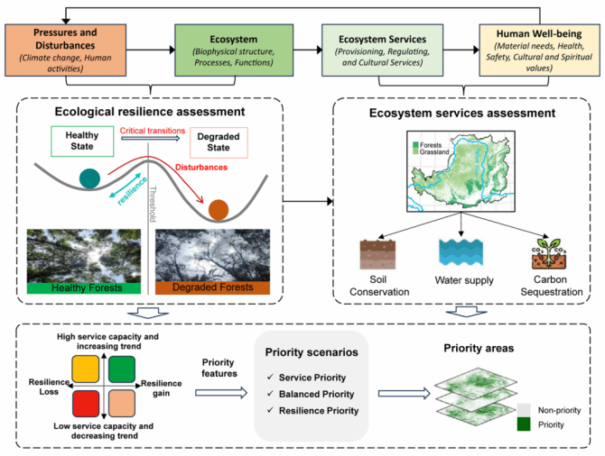 在生态恢复和土地管理实践中,生态系统服务的提升常被视为衡量治理成效的重要指标,但其改善是否必然意味着生态系统更加稳定,长期以来缺乏系统评估。针对这一关键科学问题,该研究以生态环境脆弱、同时经历大规模生态恢复工程的黄土高原为研究区,基于多源遥感数据,利用临界减速(Critical Slowing Down, CSD)理论刻画生态系统韧性变化,并同步评估土壤保持、水供给和固碳等关键生态系统服务。研究发现,2000—2020年间,尽管黄土高原生态系统服务整体显著改善,但生态系统韧性在区域尺度上出现由增强转为下降的转折趋势,约43.97%的区域被识别为韧性下降区,且在部分服务供给增强的区域同时表现出生态韧性下降特征,提示生态系统功能改善与长期系统稳定性之间可能存在潜在权衡。在此基础上,研究进一步构建了服务优先、均衡优先和韧性优先三种管理情景,系统比较不同管理目标下保护优先区的空间格局,为在生态恢复和国土空间规划中统筹推进生态功能提升与长期生态安全提供了科学依据。